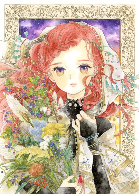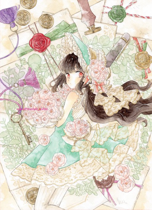 アンティークな小物、アクセサリー、庭、タッセル、季節の草花、ドライフラワー、ハーブ、ボタニカルなテーマ、レースやリボン、星、サーカス、食べ物、生活雑貨、ランプ、鍵、部屋や家具、それらと女の子を組み合わせた賑やかで可愛らしい世界が好きです。