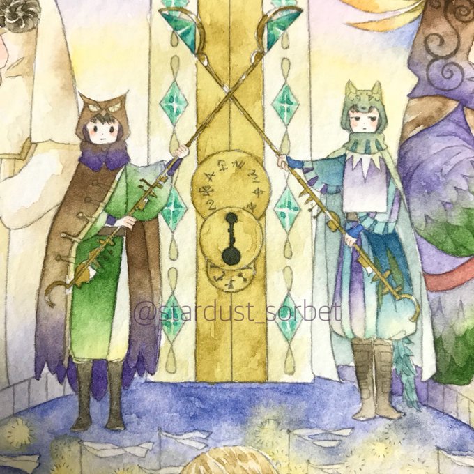 この絵で1番描きたかったところです。主人公の少年は星座盤と星の軌道のメモリを読み取って1日ずつ変わって行くたったひとつの鍵穴を計算で見つけ出さなきゃならないってお話。