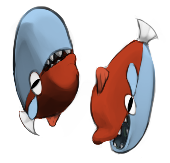#一日生物 ・クラベージ 闇の深い海中を漂い、黒を纏って生きている。 獲物の存在を確認すると、大口で飲みこんで捕獲。体内に満たされたガスで蝕んだのち、ゆっくりといただいてしまう。