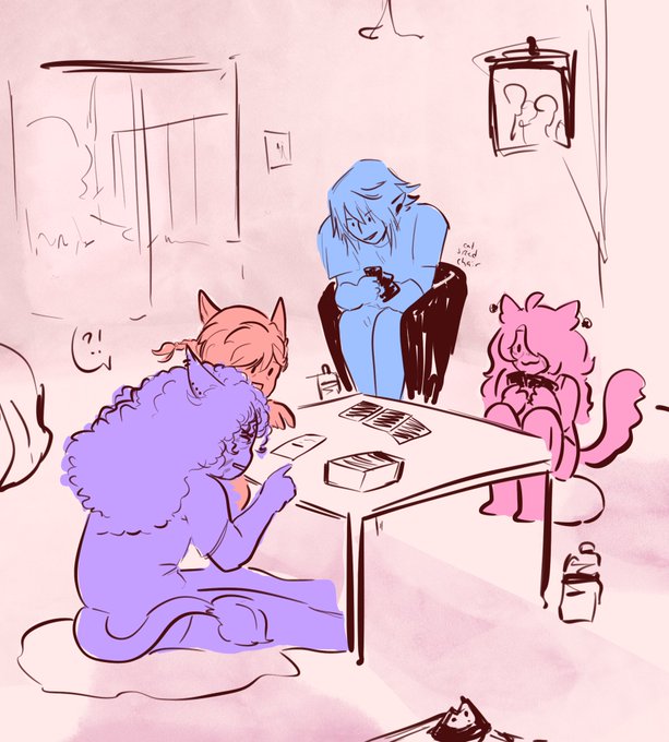 fun modern au doodles of my and @jellibee_ ‘s WoLs ft. graha making Strange Soup and haurchefant hanging stuff off the roof