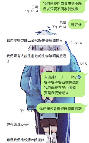 與朋友的大淹水聊天內容 是說我們學校淹水大部份的國中小+高中都會變成雅特蘭提斯ㄅwwww(半山腰的優勢