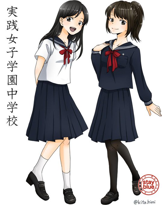 NO.411 実践女子学園中学高校(東京都渋谷区)の制服イラスト! 制服はセーラー服!胸当てこそありませんが襟は深めです。襟元のリボンは手で結ぶもの。色は中学校が赤、高校は黒色です。制服本体は中高共通の形です。