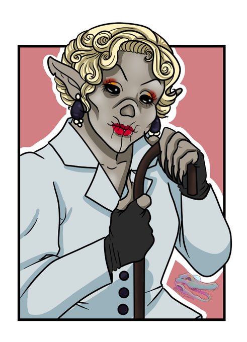I'm starting a new campaign using the Vampire: The Masquerade system. This is my Nosferatu, Sassy. She's very French, has a bunch of wigs and works as a translator. I've fallen in love with her.