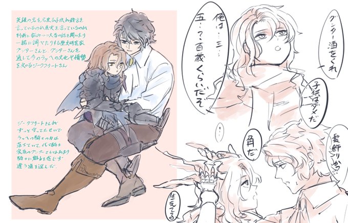 これは数百年ラッヘを守ってる竜ジークさん(弱っててちび)がへにょへにょで倒れてるのを、歴史研究してるグンターさんそっくりの青年(生まれ変わり?)がひろって一緒にわちゃわちゃする話を考えてる時のらくがき