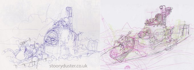 Further #illustrationart #development as The Owl and the Pussycat meet the #Submarine #Pirates. – Initial idea as a biro #doodle then layers worked up in green, red, and graphite pencil before light table then #digitalart colouring in #Gimp.