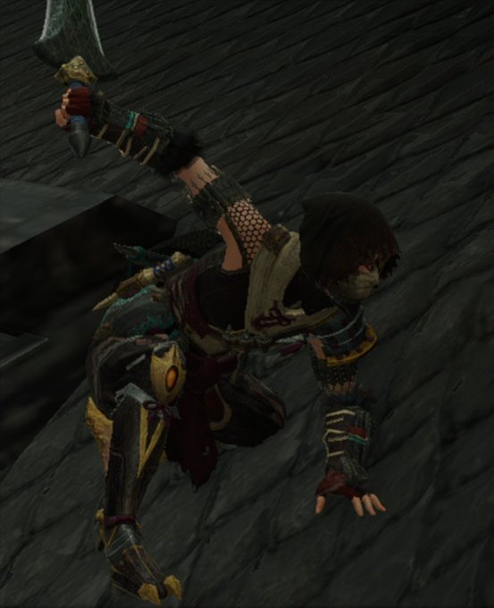 #mhrise #重ね着 #無課金 デスギア頭。ボロ布感は相手を選ぶ。アサシン、忍者、砂漠の民に適正。素直に忍者コーデに。ナルガ腰マガド脚で程よく布質感で纏め、腕はドーベル。月が沈むのめちゃめちゃ待ちました🤭