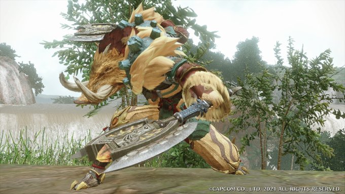 #mhrise #重ね着 #無課金 ファンゴ頭。徹底的に肌を隠し毛皮を合わせるべくまずはゴシャ胴。頭のボリュームに格を合わせる。便利な金色は腕で。腰はベリオで。脚で肌が見えてしまってはどんな腰も台無しになるので。で、禍脚しか残らないわけで。腿は実は起毛です。爪が二本なのも猪コーデに都合良し。