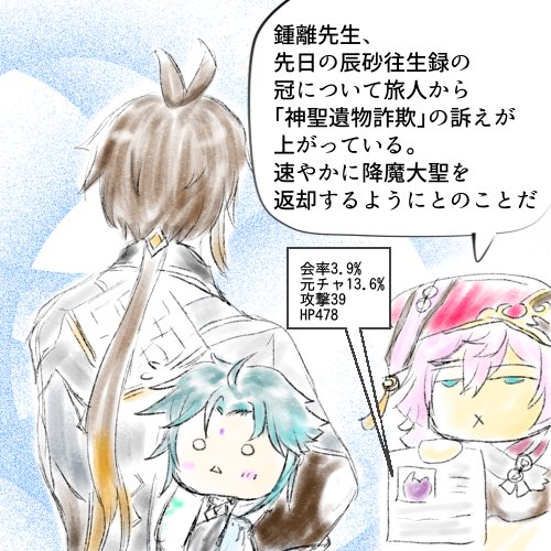 ⚖️「異議あり。裁判長、ここに鍾離先生の降魔…こほん、魈に対する評価がある。〈帰離原の少年仙人〉つまり二千歳など仙人の基準では少年という訳だ」