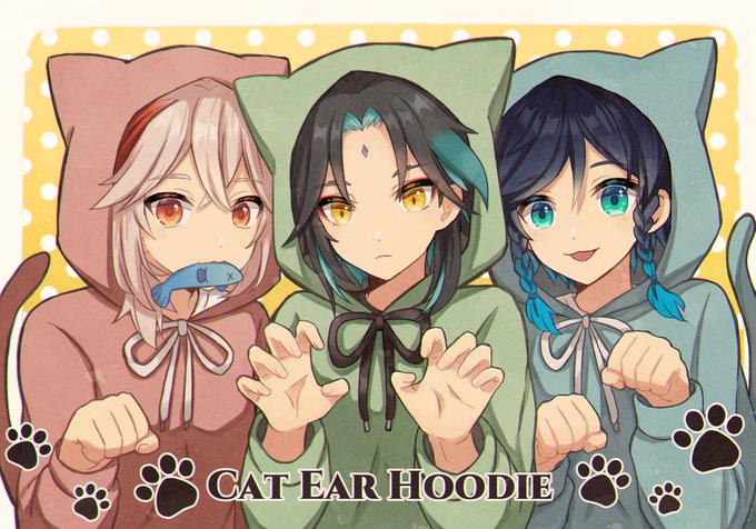 猫の日なので、猫耳パーカーの風元素男子たち😸魈にゃんだけ猫の手できてない🤗 #原神