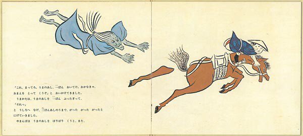 8月29日は馬肉を愛する日 に、ちなんだ絵本 【うまかた やまんば】 仕入れた魚を馬で輸送中の馬方が山姥に襲われます 魚だけでなく、馬まで食べられてしまいます❗️ 何とか逃げ込んだ家は山姥の家で 絵本が縦読みになり馬方の復讐劇が始まります😈 色々馬方(美味かった・上手かった)な絵本です😁