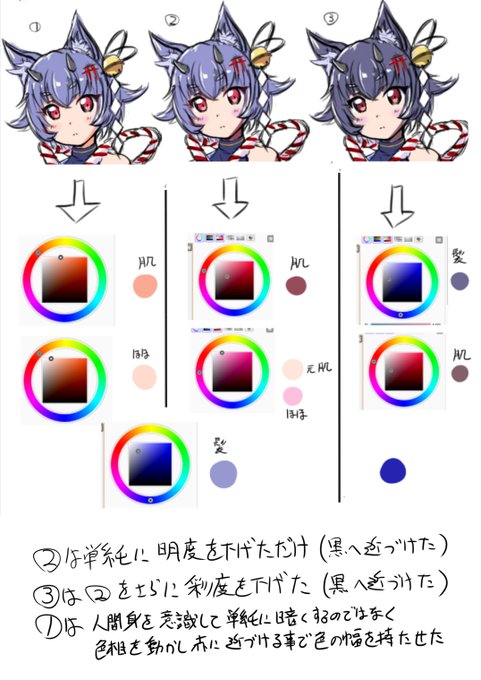 配色のお話。多分イラストが黒ずんで見えるって場合は大体の方が彩度ばかり意識して色相を意識できてないって場合が多いです。