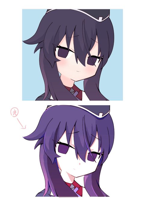 @asuya6631 まず、光源の位置を決めます。その次に影ははっきりと入れましょう。その後、それでもパキっとしなかったら第三の影を入れて髪の毛の重なる部分を暗くします。(ただし黒にするのではなく違う色を合わせる事をオススメします。)あと基本ベースの紫が暗すぎるのでもう少し明るくすると塗りやすいです。