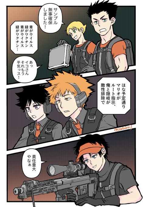 イコさんのあの衣装がバイオっぽくみえたので、生駒隊でそれっぽいやつ。ベースにもどったあとみんぐが海に「で、何色が何やって?」って聞いて「えっと、赤が…」「赤ないやろ」「あれー?」ってやりとりしてくれ。