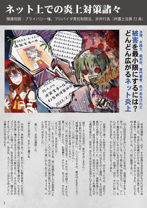 本日の紅楼夢「E-14a」にて、『同人作家のための法律対策本』を2冊頒布いたします。1冊目は夏コミの既刊で、ネット上の名誉毀損に絡む内容を、2冊目は今回の新刊で、ネット上の炎上対策と違法ダウンロードを取り上げました!