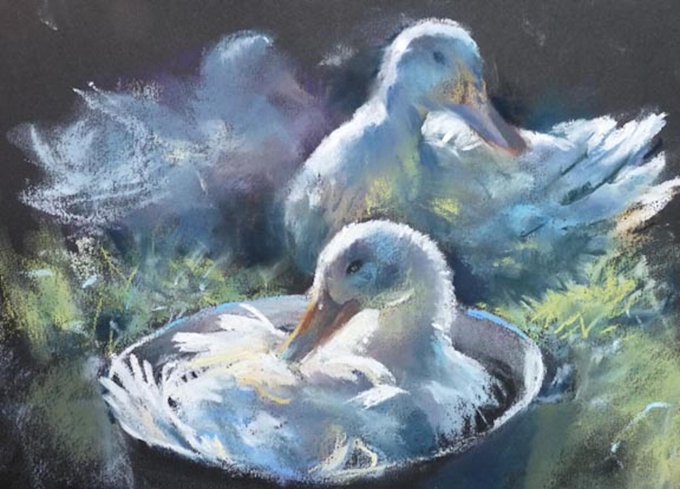 "The Old Preserving Pan" Pastel of Indian runner ducks