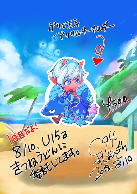 C94 8/10 お品書き! 私からはアクリルキーホルダーを東U15a「きつねうどん」さんのところに 委託させて頂いてます。 完成品はリンク先を参考にどうぞ! イルカチャームでちょっと可愛くしました! サイズはそんなに大きくないよ~!
