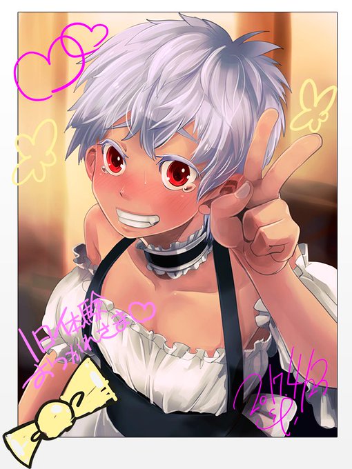 イカ4倒せなかったおすし君に課せられたペナルティは ジュレ住宅街某所のメイドカフェでの1日体験コースだったそうです。 せっかくなので構図も構図なのでメイドカフェのチェキ風にしておきました(?) ねます。
