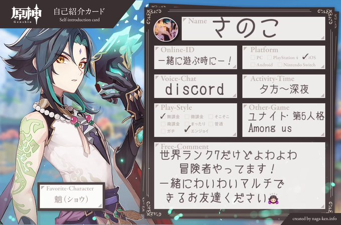 強さとかあんまり気にせずにわちゃわちゃ楽しめるお友達募集です〜! ♡or♲で気になった方お迎え行きます🙌🏻 #原神 #原神自己紹介カード #原神好きさんと繋がりたい
