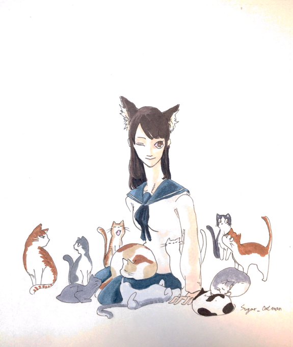 ネコミミJKと集会 #絵描きさんと繋がりたい #アナログ絵 #猫の日