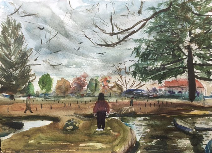 近所ではない公園と鳥見てる人 #絵 #水彩