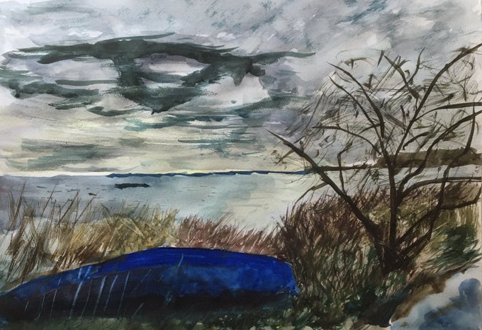 馬堀海岸あたりの雲とかとボートとか #絵 #水彩絵の具 #馬堀海岸