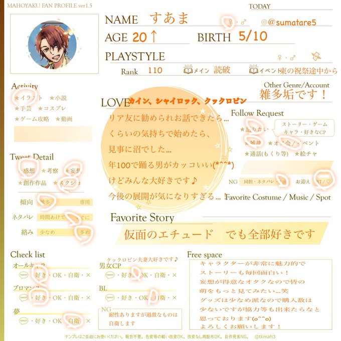 @tos 友人の勧めではじめたらどハマりしてしまいました! ゆるふわプレイヤーの雑多垢ですが良ければ仲良くしていただけると幸いです😊 ごくまれーにお絵描きもします #まほやく自己紹介カード #まほやく好きさんと繋がりたい #まほやくクラスタさんと繋がりたい