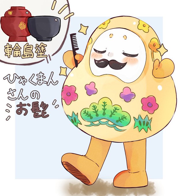 ひゃくまんさんのお髭は石川県輪島市の漆器、輪島塗でできているんだよ。