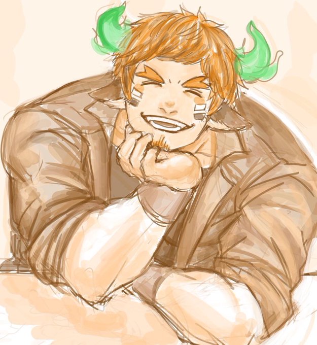 @fukutsuTL 練り手直ししてた・・・ 普段は糸目、時々開眼 刈り上げてるけどお団子してる おじさんとお兄さんの間ぐらい お菓子好き
