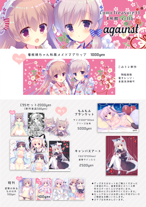 【こみトレ告知】1月20日こみっくトレジャー33 4号館イ-11b「against」冬コミで出したものとこみトレ新作の看板娘ちゃん和メイドマグカップを持っていきます!ポスターと色紙の抽選(くじ引き方式)もあります~どうぞよろしくお願いいたします☺️✨