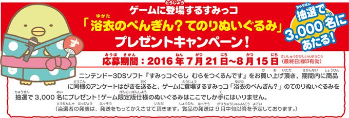 3DSソフト『すみっコぐらし むらをつくるんです』を買って、8/15までにキャンペーンに応募すると「浴衣のぺんぎん?のてのりぬいぐるみ」が抽選で3,000名様に当たっちゃうんです。応募方法は簡単なので、是非応募してほしいんです!