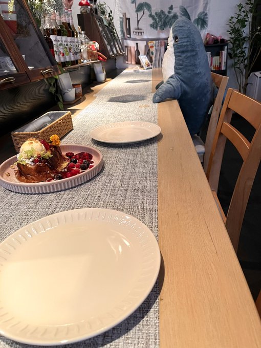 サメと相席してきた。かわいい店内とかわいい本棚とかわいいメイドさんとかわいいデザート。かわいいです。メイド服めっっっちゃかわいい…。すきです。