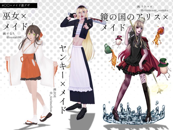リトマス(@ ritomasu_sosaku)主催の「○○×メイド誰デザ」に参加しました💖🦹♀️ 私は巫女メイドの絵を担当しました😽 ツリーにアンケートを繋げるのでどれがすなちのデザインか当ててネ! #リトマスのメイド誰デザ
