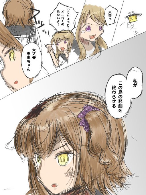 『主人公:春日未来』『友達:所恵美』で描かせていただきました!お題ありがとうございます♪ ピンチに際して覚悟を決めた恵美と、頭を打って何かが覚醒した未来。 #アイドル投票TC #TC春日未来 #TC所恵美 #孤島サスペンスホラー