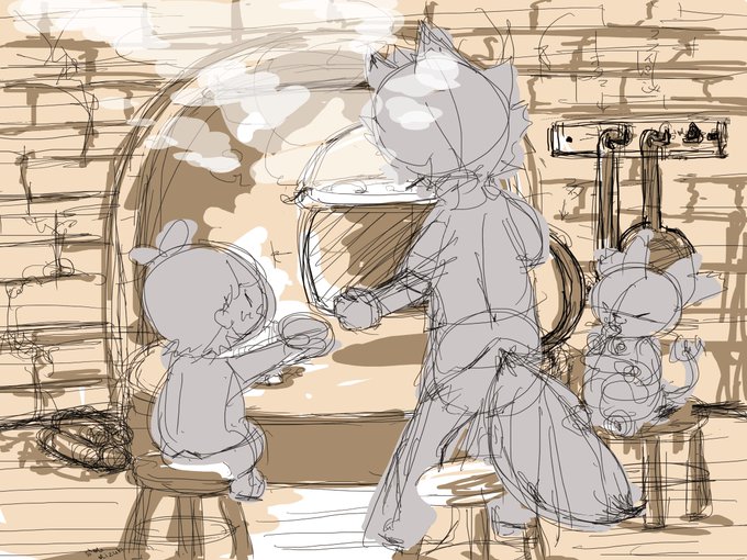 育ち盛りは夜お腹すいちゃうよね。#オンボロキッチン 2枚目は結構気に入っていた線画。