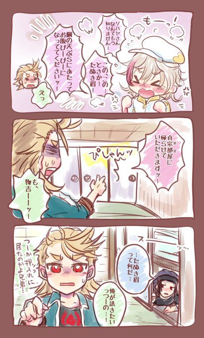 「頭文字じゃなくてもいいのか?」「藤四郎兄弟だいたい該当するのでは?」という疑問も抱きつつ、前田のアピールと己の欲に抗えない大典太であった。※土用の丑のでんまえ漫画です