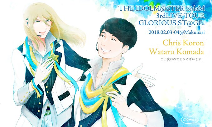 こちら(@K_C_3rdflower)のクリスさん・駒田さん宛フラスタのイラストとデザインお手伝いさせて頂きました!イメージ画と素材をお花屋さんに託したら想像の百倍海が見えて震えています…。会場で見かけたら是非海を感じてくださいね!縮小されてそうなので顔周りのアップも置いておきます〜