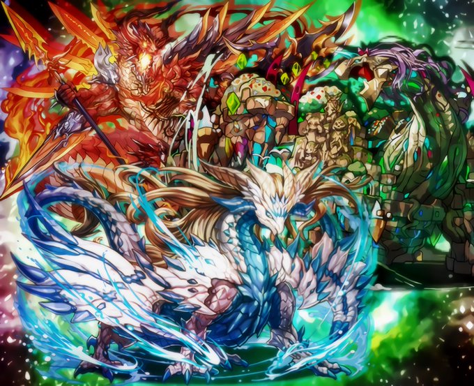 レーダードラゴン5体のTwitterヘッダーサイズです! ノアドラが欲しい…ノアドラが… RT,ふぁぼいただけると嬉しいです #パズドラ #画像加工 #サカヅキ風