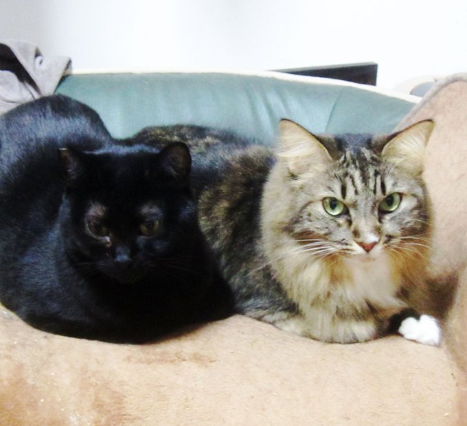 今日は猫の日でありましてー。うちのハルさんとラス(フィル)さん。ぼちぼち仲がいい、というかお互いあんま気にしない感じ。甘えん坊で2匹とも乗ってくると重いのでありましてー。 #ブレイヴガール #猫の日
