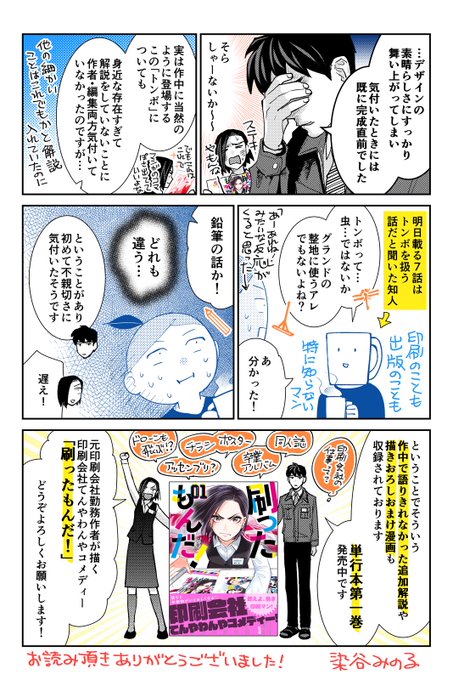 【中押しご希望の書店様へ】「#刷ったもんだ !」1巻発売時に、作者の染谷みのるさんがTwitterにUPした「告知漫画(裏話バージョン:描き下ろし」3ページ。これを店頭の宣伝物としてご活用頂ける書店様、いらっしゃいましたらメールでデータをお送りしますので、お気軽にリプ下さい。(続く)