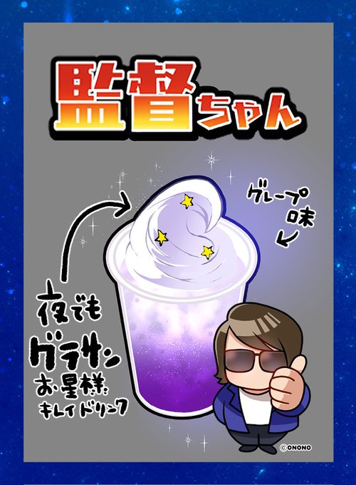 小野さゆりちゃんのLINEスタンプからイメージされたドリンクがあり、私のイメージのはグラサンドリンク。お星様と紫のしゅわしゅわの怪しげなグレープソーダドリンクだそうです(笑)