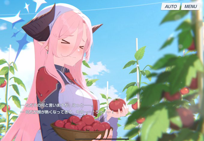 (案内された畑は見事なものだった。火の国ゲヘナの恵みを受け、輝かんばかりの実りが眼前に広がる。これほどの菜園を育て上げたこいつは、さしづめ豊穣の女神だろうか。間近で微笑むと、我らが女神殿はトマト顔負けに真っ赤になるのだった)