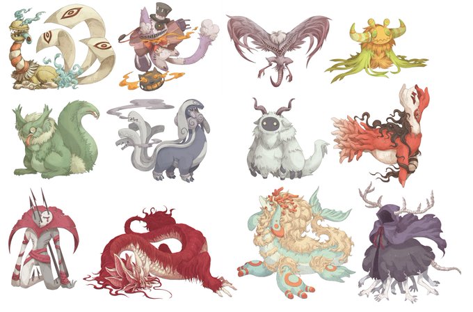 遥か昔~2年前くらいまで不定期でやってた、フォロワーさんから【テーマカラー、住処、キーワードいくつか】など、デザイン制限をもらってモンスターデザインする修行で描いた子たち
