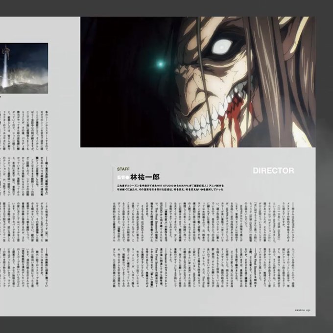 【特集 MAPPAの現在形 発売中】『#進撃の巨人 The Final Season』の監督・林祐一郎をはじめ、シリーズ構成・瀬古浩司、キャラクターデザイン・岸友洋らが語る制作秘話。さらにエレン役・梶裕貴&ライナー役・細谷佳正のインタビューも。MAPPAが描く「最後の進撃」とは。ぜひ本誌にて。#shingeki #SWITCH https://t.co/kFl4AxxE8f