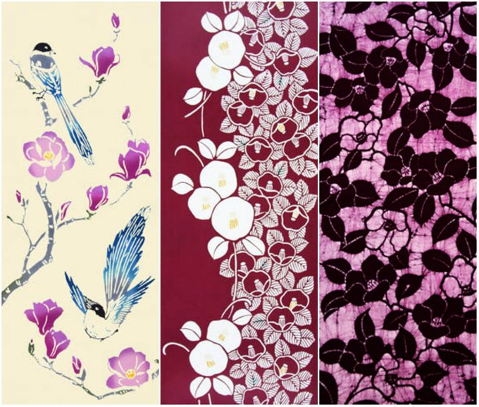 寒さが続いて春が待ち遠しく感じるので花の手ぬぐい、「椿」が2種類と「木蓮に尾長」。椿は注染と臈纈染めを合わせた技法で独特の雰囲気のものが一本あります。尾長は飾るのに素敵な色合いと構図。どれも渋い赤系で。#梨園染 の注染手ぬぐいです。