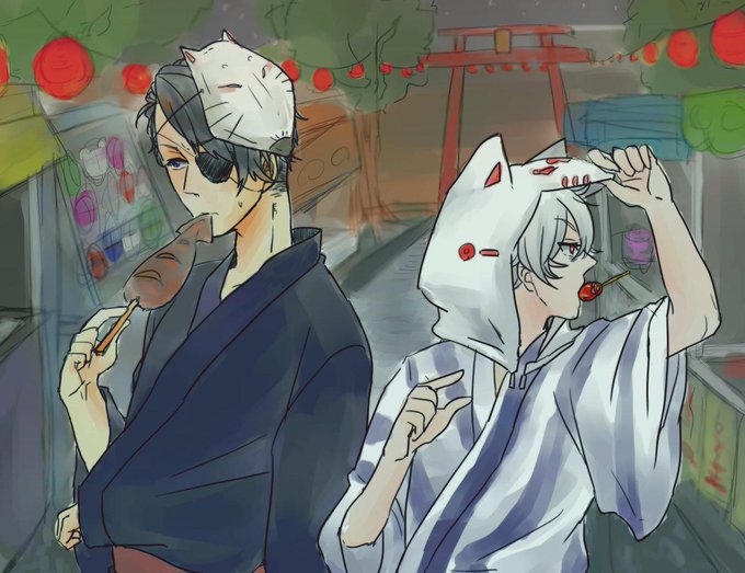 イラボの一部ですが。この男の子は部誌漫画の男の子です。そして右にいる猫又は部誌漫画と線画交換に出てくる女の子の猫の方です。