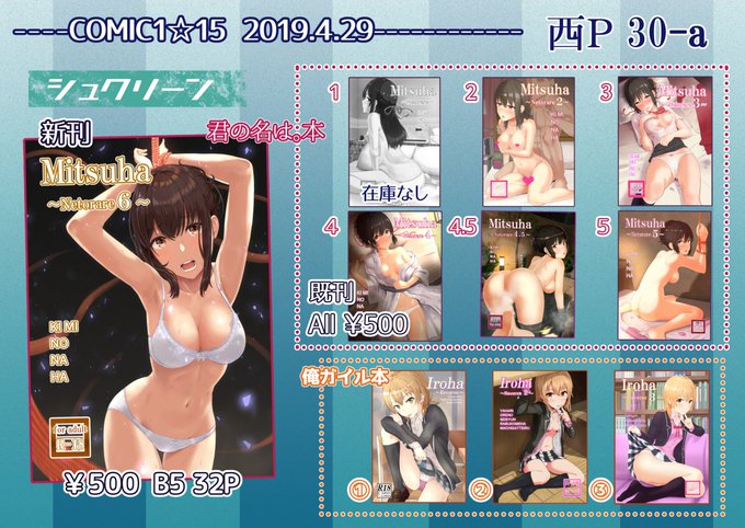 新刊は君の名はNTRシリーズ続編の「6」になります。「2」もごく少数ですが確保できましたので持っていきます。いろはす本も少数残っていますのでお求めの方はお声がけください。当日は新刊に四葉チラシがつきます。よろしくお願いします🌸