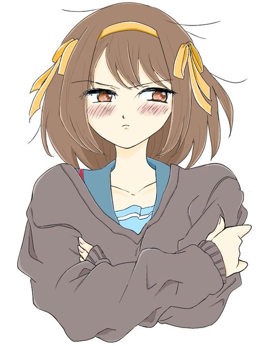 色を塗りました!明るい茶髪になっちゃった、、 この絵には「普段、胸板の平たいキョンが着ているときには胸の部分の生地なんて隆起しないセーターが、ハルヒが着たことによって初めてその部分の生地が隆起している」という萌えを練り込みました。