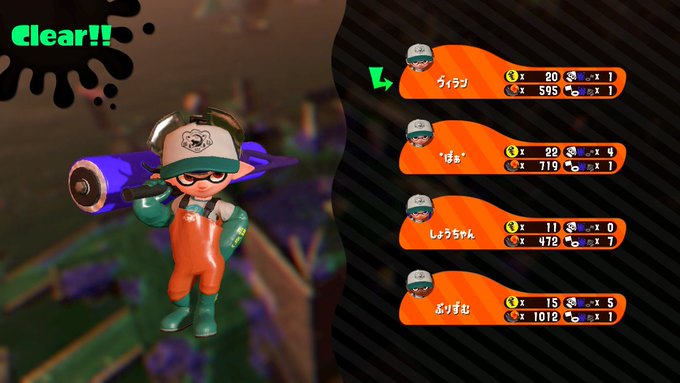 @oioini_a ヴィラン「唯一、安全に早く処理できるのってスシとノヴァだったもんな😅今回のバイトはめっちゃ左右されたぜ💦俺の方こそコンテナ付近に押し寄せてくるシャケ達を片付けておいてくれて助かったぜ😉ありがとな😊」