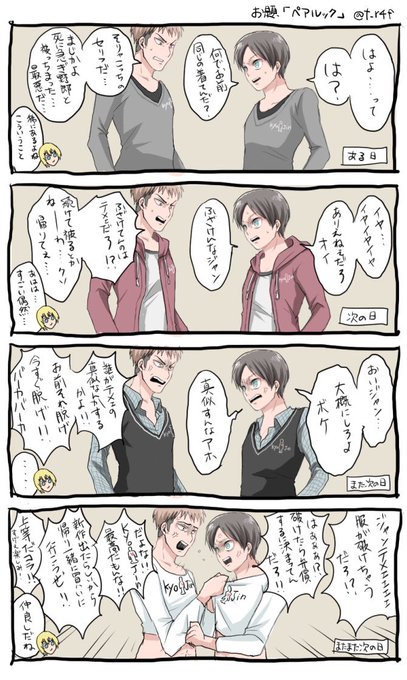遅刻すみません!時間も危うかったんで字めっちゃ汚いです!この後クソダサなペアルックで仲良くショッピングしましたとさ。 #ジャンエレ版深夜の真剣お絵描き60分一本勝負