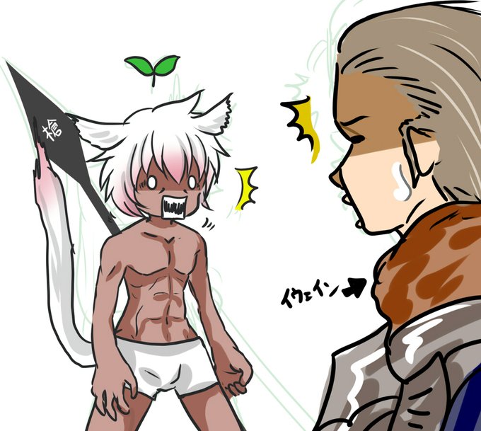 FF14(超初心者) ※ジョブチェンしたくて槍術士ギルドに行ったら。「まずは槍を装備しろと」偉い人が言ったので、その通りにした結果。偉い人の目の前でパンツ一丁になってしまった旅猫の図。この後、何故か服が着れなくて困ってた。 今、フールクって男に粘着されてる。怖い